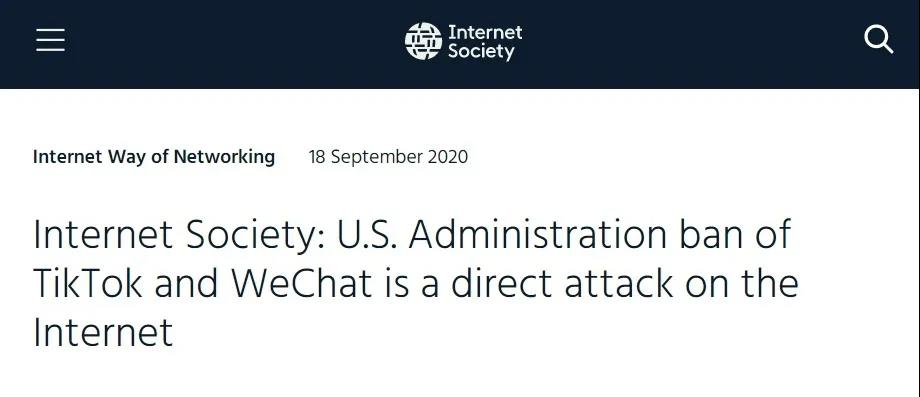 9月18日,針對日前美國政府對TikTok(抖音海外版)和微信的禁令,國際互聯(lián)網(wǎng)學(xué)會(Internet Society)發(fā)表聲明表示,美國政府對TikTok和微信的禁令是對互聯(lián)網(wǎng)的直接攻擊。