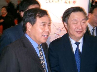 (圖為信產(chǎn)部部長(zhǎng)王旭東在教育部科技發(fā)展中心主任李志民陪同下參觀CERNET展示區(qū))