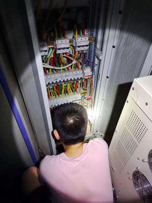 19:30,夜幕降臨,平時燈火通明的機(jī)房幾乎一片漆黑。節(jié)點(diǎn)老師李正磊核對UPS開關(guān)接入位置。