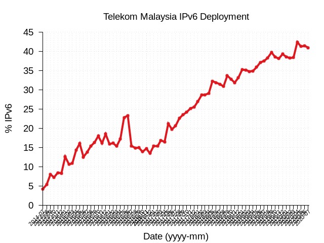 從圖15的曲線圖中以看出,3BB IPv6部署率在三年多的時間內(nèi)實(shí)現(xiàn)了從0到64%的突破。Telekom Malaysia是馬來西亞唯一的電信公司,目前IPv6的部署率接近45%(圖16)。