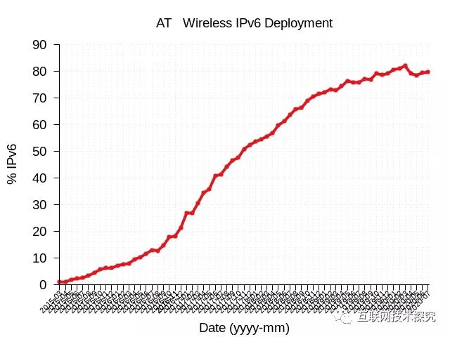 因此,他們的IPv6流量增加顯著,超過65%的用戶使用IPv6(圖9)。美國運(yùn)營商AT&T的IPv6部署率達(dá)到了80%(圖10)。