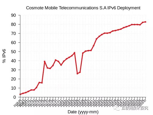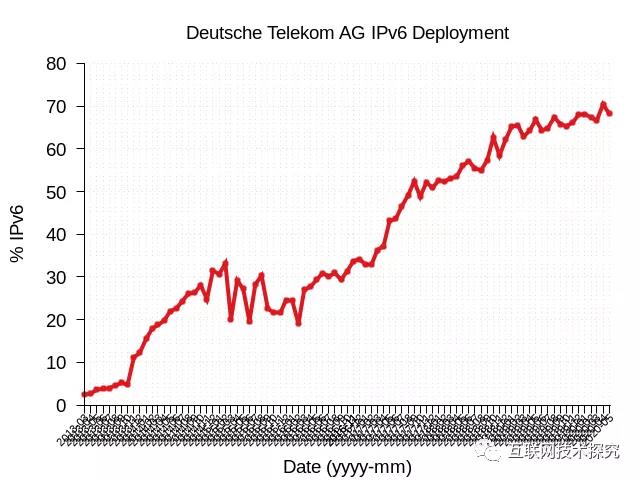 歐洲方面,Cosmote是希臘最大的移動運(yùn)營商,用戶達(dá)到了790萬,圖5顯示它在2016年開始啟用IPv6,在4年內(nèi)將IPv6部署率提升到了80%。德國電信運(yùn)營商Deutsche Telekom AG,在7年時間內(nèi)將IPv6部署率提升到了70%(圖6)。