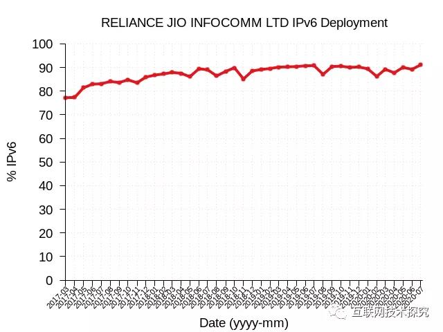 在亞洲方面,日本運(yùn)營商SoftBank在五年內(nèi)就將IPv6部署率從4%提升到了46%(圖7)。印度的電信運(yùn)營商Reliance Jio則在短短幾年內(nèi)就增長到了90%(圖8)。