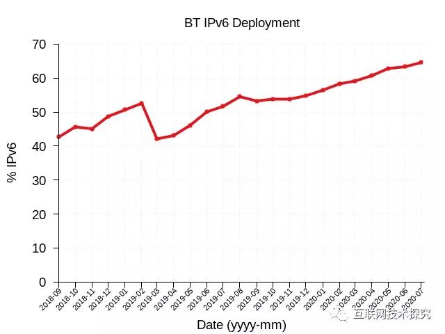 在歐洲方面,Nethys(VOO)是比利時當(dāng)?shù)氐挠芯€電視運(yùn)營商,圖12顯示,VOO從2013年就開始支持IPv6,并在2020年將IPv6部署率提升到了80%。BT-British Telecom是英國最大的電信運(yùn)營商,英國所有的電話線都是要通過他們進(jìn)行開通。